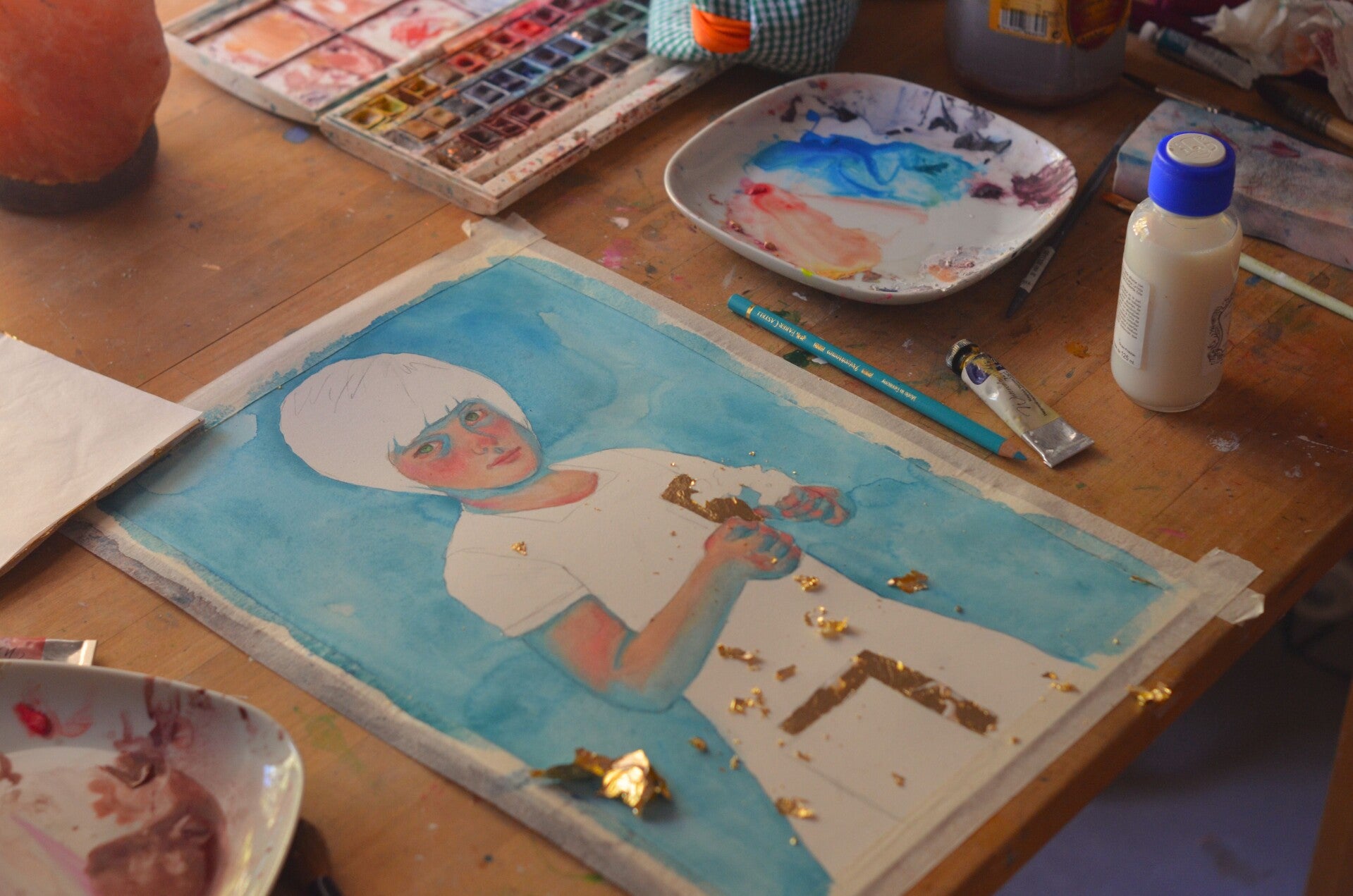 Trabajo principalmente con retratos, sobre todo en acuarela, aunque me gusta experimentar con otras técnicas y materiales según lo que quiera contar.